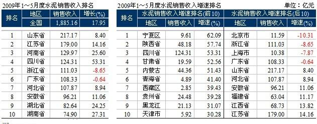 1~5月,水泥產(chǎn)業(yè)實(shí)現(xiàn)銷(xiāo)售收入1885.16億元,同比增長(zhǎng)17.95%。銷(xiāo)售收入增速前10名的地區(qū)的增速都在30%以上:寧夏省銷(xiāo)售收入大幅上漲62.09%;四川在繼2007年收入大幅增長(zhǎng)的情況下,受災(zāi)后重建拉動(dòng),市場(chǎng)仍然向好,實(shí)現(xiàn)了124.31億元的銷(xiāo)售收入,同比增長(zhǎng)53.31%。增速前10 的4個(gè)地區(qū)位于西北,三個(gè)位于西南。