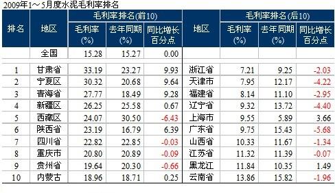 毛利率排名后10的多為沿海地區(qū),大部分地區(qū)低于去年同期水平。2009年水泥市場(chǎng)需求旺盛超出預(yù)期,煤、油原燃料的供應(yīng)情況也好于去年,但產(chǎn)業(yè)的利潤(rùn)情況沒(méi)有得到明顯改善,主要是礙于產(chǎn)能釋放的壓力。去年8月,數(shù)字水泥網(wǎng)根據(jù)對(duì)水泥投資的追蹤,感覺(jué)到迅速擴(kuò)張的產(chǎn)能將在2008年底和2009年釋放,面對(duì)去年3季度開(kāi)始的市場(chǎng)需求下滑態(tài)勢(shì),勢(shì)必對(duì)水泥市場(chǎng)造成巨大的壓力。因此,9月在北京連續(xù)兩天召開(kāi)市場(chǎng)研討會(huì),業(yè)界人士與資本市場(chǎng)行業(yè)分析師及相關(guān)媒體共同對(duì)市場(chǎng)的走勢(shì)進(jìn)行分析,中國(guó)水泥協(xié)會(huì)會(huì)長(zhǎng)雷前治親臨會(huì)場(chǎng)發(fā)言。會(huì)后,數(shù)字水泥網(wǎng)又走訪了海螺、冀東等水泥集團(tuán),交流了對(duì)市場(chǎng)的看法,警示行業(yè)和企業(yè)對(duì)市場(chǎng)風(fēng)險(xiǎn)的關(guān)注。