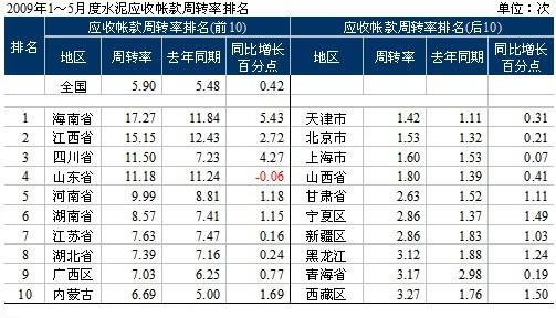 隨著銷(xiāo)售收入的快速增長(zhǎng),1~5月應(yīng)收賬款有所上升,為341.96億元,同比上升了15.66%,上升幅度在合理范圍。應(yīng)收賬款周轉(zhuǎn)率卻較2008年同期加快0.42,達(dá)到5.90次。在應(yīng)收賬款周轉(zhuǎn)率排名前10的地區(qū)中,海南、江西、四川和山東在10次以上,河南接近10;天津、北京、上海三大直轄市回款現(xiàn)象都不佳,值得注意的是應(yīng)收賬款周轉(zhuǎn)率排名后10中有4個(gè)是西北地區(qū),利潤(rùn)重要,拿到現(xiàn)金更為重要,不但要叫好還要叫座。
