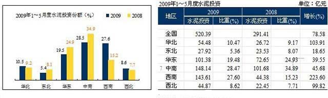 過(guò)于旺盛的市場(chǎng)需求也引來(lái)高熱度水泥投資,2009年1~5月水泥投資仍然延續(xù)2908年的強(qiáng)勢(shì)。2008年1~5月水泥投資比2007年增長(zhǎng)60%,而今年1~5月增長(zhǎng)勢(shì)頭更加強(qiáng)勁達(dá)到78.58%。如果下半年投資不放緩,對(duì)未來(lái)市場(chǎng)的壓力將會(huì)越來(lái)越大。