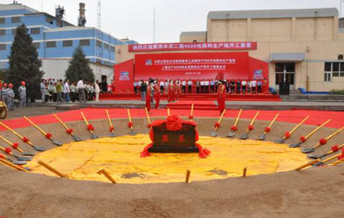 2009年8月28日上午,在偉大祖國成立60周年慶典之前夕,內(nèi)蒙古蒙西水泥集團(tuán)500萬噸熟料基地二期日產(chǎn)4500噸水泥熟料生產(chǎn)線在蒙西高新技術(shù)工業(yè)園區(qū)隆重舉行奠基儀式。