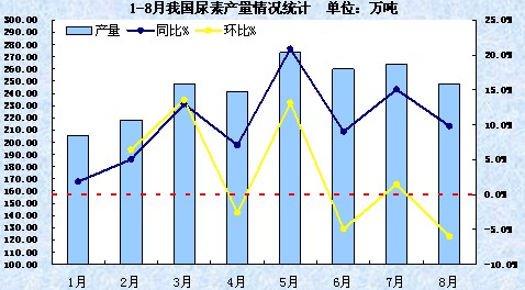 2009年1-8月我國尿素產(chǎn)量累計(jì)1958.2萬噸,同比增長10.37%。8月份,中國尿素產(chǎn)量同比增加9.8%,環(huán)比降低6%。