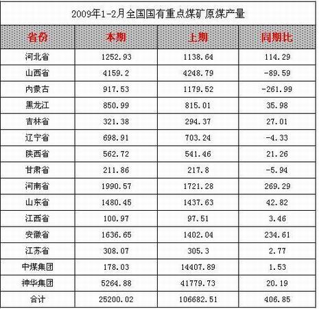 2009年1-2月全國(guó)國(guó)有重點(diǎn)煤礦原煤產(chǎn)量