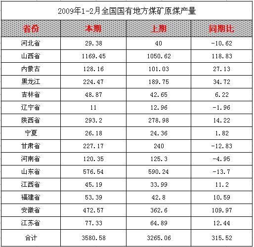 2009年1-2月全國國有地方煤礦原煤產(chǎn)量