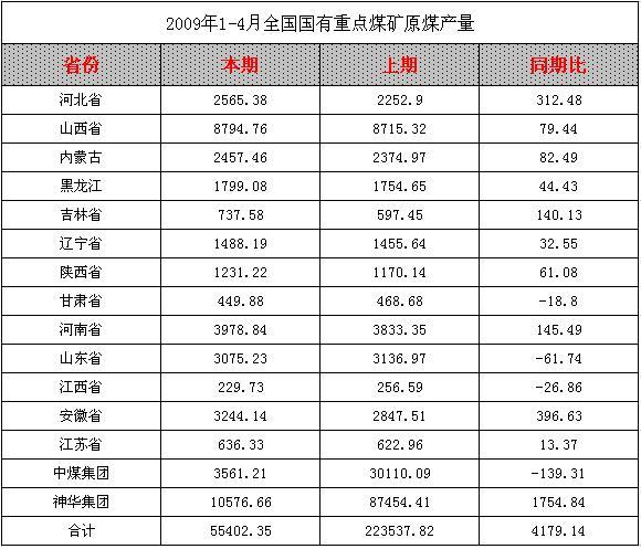 2009年1-4月全國(guó)國(guó)有重點(diǎn)煤礦原煤產(chǎn)量