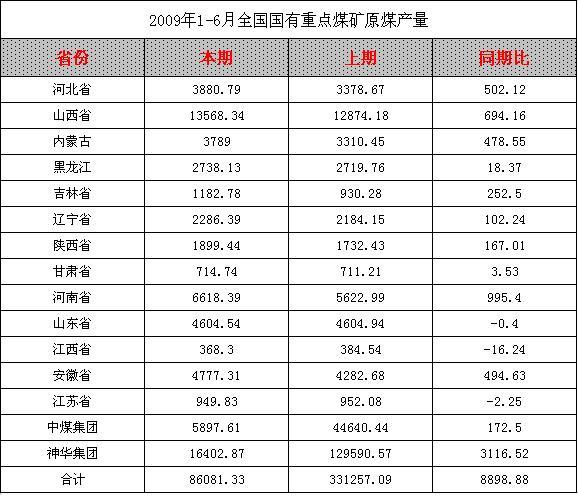 2009年1-6月全國國有重點(diǎn)煤礦原煤產(chǎn)量統(tǒng)計(jì)
