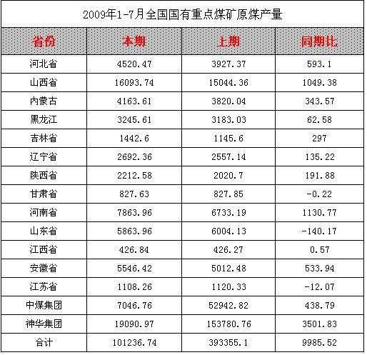 2009年1-7月全國國有重點煤礦原煤產量統(tǒng)計