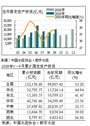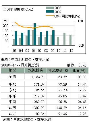 ——1~9月份,全國(guó)水泥固定資產(chǎn)投資額為1,184.71億元,投資總額已超過(guò)上年全年,同比增長(zhǎng)63.39%;