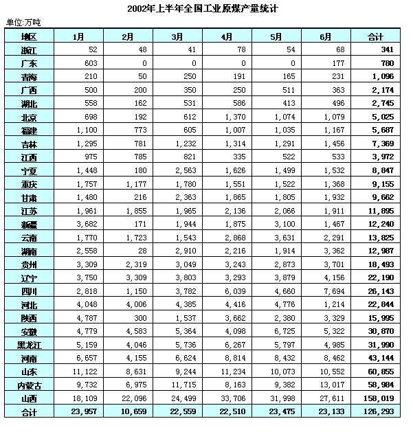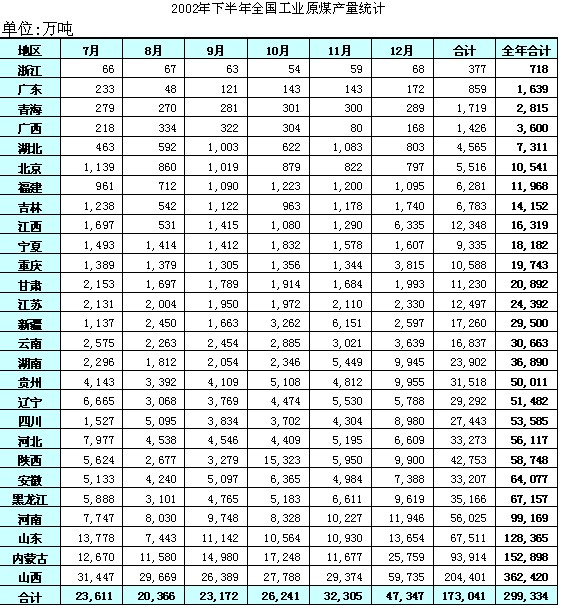 2002年全國工業(yè)原煤產(chǎn)量統(tǒng)計