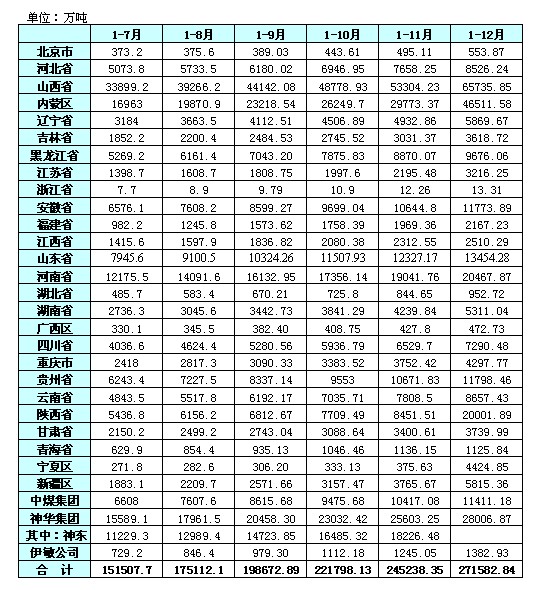2008年全國工業(yè)原煤產(chǎn)量統(tǒng)計