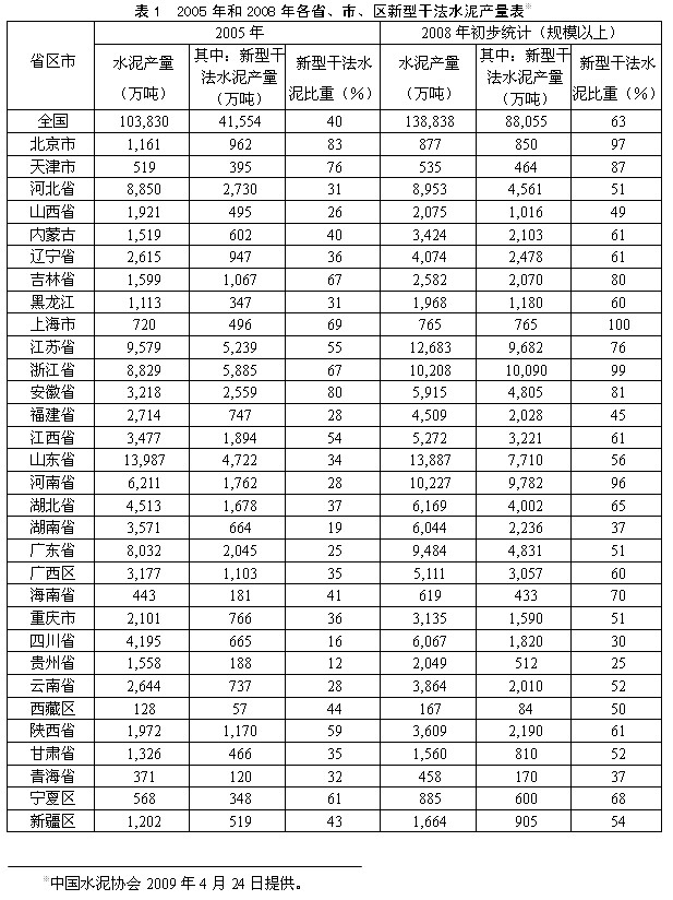 水泥不宜遠運,與鋼鐵等產(chǎn)品不同,水泥市場是地區(qū)性市場。從表1可看到,2008年我國各省、市、區(qū)水泥總產(chǎn)量和新型干法產(chǎn)量有很大差別。浙江省、河南省等人均水泥產(chǎn)量較高,新型干法產(chǎn)量比例已達95%以上;山西省、湖南省和四川省等人均水泥產(chǎn)量較低,新型干法產(chǎn)量比例都在50%以下。通過各種信息渠道獲悉,在人均水泥產(chǎn)量和新型干法比例較高的少數(shù)省份已出現(xiàn)新型干法產(chǎn)量過剩問題;在水泥價格高和需求量大的少數(shù)省份出現(xiàn)了盲目建設(shè)新型干法生產(chǎn)線現(xiàn)象,即將產(chǎn)生產(chǎn)能過剩。但是,大部分地區(qū)不存在新型干法產(chǎn)能過剩問題。