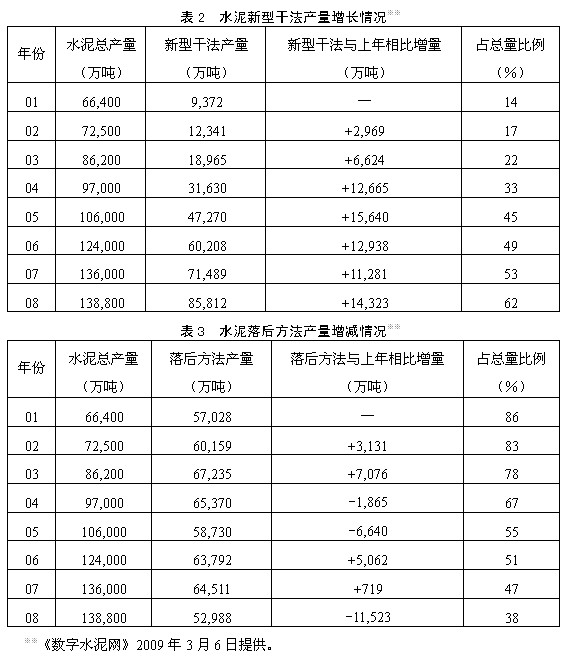 進入新世紀后,水泥工業(yè)結(jié)構(gòu)調(diào)整取得很大進步。從表2可看到,新型干法水泥產(chǎn)量占總產(chǎn)量的比例由2001年的14%提高到2008年的62%。從表2和表3的數(shù)據(jù)可以得出,近幾年我國水泥總量的增長和結(jié)構(gòu)調(diào)整,主要依靠新型干法的迅速發(fā)展,而落后方法產(chǎn)能的淘汰量并不大。2001年水泥落后方法產(chǎn)量約5.7億噸,2008年約5.3億噸,8年間只下降了0.4億噸?梢姡蕴浜笊a(chǎn)方法的任務(wù)十分艱巨。為在3年內(nèi)徹底淘汰落后方法產(chǎn)能,必須采取正確方針和得力措施。