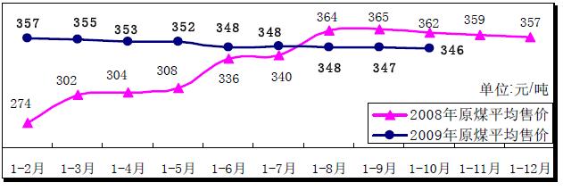 從售價看:1-10 月,原煤平均售價346.31 元/噸,同比減少16.78 元/噸,下降4.62%;比1-9 月減少0.61 元/噸,下降0.18%。原選煤平均售價411.40 元/噸,同比減少32.11元/噸,下降7.24%;比1-9 月減少0.62 元/噸,下降0.15%。