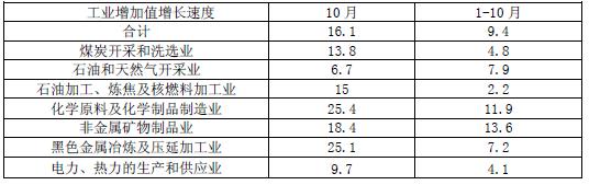煤炭開采和洗選業(yè)工業(yè)增加值環(huán)比繼續(xù)增加,但10 月份當月煤炭開采和洗選業(yè)工業(yè)增加值和相關(guān)行業(yè)相比仍然偏低,并且明顯低于全國平均水平。從1-10 月累計工業(yè)增加值來看,非金屬礦物制品業(yè)、化學原料及化學制品制造業(yè)、石油和天然氣開采業(yè)和黑色金屬冶煉及壓延加工業(yè)等行業(yè)工業(yè)增加值均明顯高于煤炭行業(yè);電力、熱力的生產(chǎn)和供應業(yè)及石油加工、煉焦及核燃料加工業(yè)兩個行業(yè)工業(yè)增加值低于煤炭行業(yè)。