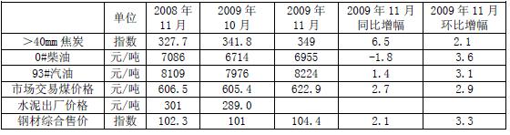 從實際監(jiān)測煤炭及相關(guān)產(chǎn)品價格可以看出,從同比來看,因去年同期在金融危機影響下,煤炭及相關(guān)產(chǎn)品需求疲軟,價格處于相對低位,因此今年11 月份除0 號柴油外,煤炭及多種相關(guān)產(chǎn)品價格同比上漲,其中,煤炭價格同比漲幅僅次于焦炭;從環(huán)比來看,隨著宏觀經(jīng)濟的持續(xù)回暖,煤炭及相關(guān)行業(yè)產(chǎn)品需求增加,價格均環(huán)比上漲,其中煤炭價格漲幅居中。