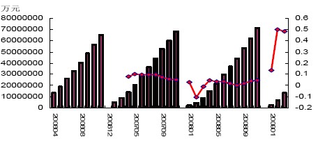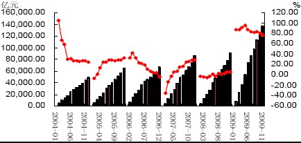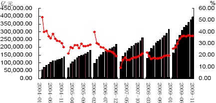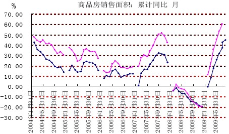 另外,去年四季度以來中央和地方政府的大規(guī)模投資也在今年的施工項(xiàng)目和開工得到體現(xiàn)。2009年1-10月份,累計(jì)施工項(xiàng)目達(dá)到402204個(gè),同比增加95435個(gè),施工項(xiàng)目計(jì)劃總投資375859億元,同比增長36.6%;新開工項(xiàng)目達(dá)到293412個(gè),同比增加85329個(gè),新開工項(xiàng)目計(jì)劃總投資達(dá)到124610個(gè),同比增長81.1%。 圖4:新開工項(xiàng)目計(jì)劃總投資額及累計(jì)同比增速 圖5:施工項(xiàng)目計(jì)劃總投資額及累計(jì)同比增速 2.2、房地產(chǎn)投資將成為明年需求的重要看點(diǎn) 對于房地產(chǎn)繼續(xù)成為明年水泥行業(yè)需求的重要方面,我們的理由如下: 在去年四季度末國家信貸和行業(yè)優(yōu)惠政策刺激下,09年房地產(chǎn)行業(yè)迅速走出低谷,成交量和成交價(jià)格均大幅上揚(yáng),成交價(jià)格甚至創(chuàng)出新高,之前市場就普遍擔(dān)憂政府會否再一次祭起調(diào)控大旗。但是近期召開的中央經(jīng)濟(jì)工作會議表明,“加強(qiáng)和改善宏觀調(diào)控,實(shí)施積極的財(cái)政政策和適度寬松的貨幣政策”、“要把滿足居民合理改善居住條件愿望和發(fā)揮房地產(chǎn)支柱產(chǎn)業(yè)作用結(jié)合起來,增加保障性住房供給,減輕居民合理購買自住商品住房負(fù)擔(dān),發(fā)揮房地產(chǎn)在擴(kuò)大內(nèi)需中的積極作用”政府對未來房地產(chǎn)行業(yè)的發(fā)展還是采取了相對鼓勵(lì)和肯定的態(tài)度。應(yīng)該來說,在公告中,中央再次強(qiáng)調(diào)了房地產(chǎn)的支柱產(chǎn)業(yè)地位,并且指出要保持房地產(chǎn)市場穩(wěn)定健康發(fā)展,并且作為明年擴(kuò)大內(nèi)需、促進(jìn)經(jīng)濟(jì)平穩(wěn)發(fā)展的主要支柱。 圖6:商品房銷售面積累計(jì)同比增速