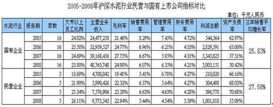 在2005年至2008年這4年間,我國(guó)滬深交易所共有21家水泥行業(yè)的上市公司,其中,國(guó)有控股上市公司16家,占76%;民營(yíng)控股上市公司5家,占24%。以下圖表為“2005-2008年滬深水泥行業(yè)民營(yíng)與國(guó)有上市公司經(jīng)營(yíng)指標(biāo)對(duì)比表”。