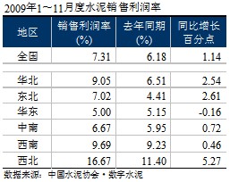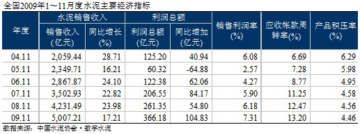 2009年1~11月,水泥市場在高需求的環(huán)境下,使得去年釋放的2億噸水泥產(chǎn)量基本消化,帶動了各項經(jīng)濟(jì)指標(biāo)的提高:除銷售收入的增速低于去年外,利潤、銷售利潤率、應(yīng)收賬款周轉(zhuǎn)率、積壓率等各項指標(biāo)都不同程度的優(yōu)于去年。但在各個區(qū)域之間表現(xiàn)不一,分化明顯。