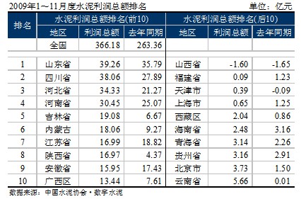 在摸索中奮進(jìn),種種迷霧和不確定性逐漸明朗。1~11月份數(shù)據(jù)顯示,盡管2009年產(chǎn)能釋放壓力前所未有,但在國家拉動經(jīng)濟(jì)政策下,水泥需求超預(yù)期,拉動水泥利潤總額、銷售利潤都高于去年水平。