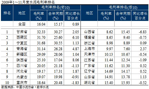 從發(fā)布數(shù)據(jù)看,西北、西南地區(qū)毛利率表現(xiàn)依然要好于其他地區(qū)。前10中,西北5省區(qū)全部入圍,西南除云南、貴州外也皆在其中,內(nèi)蒙古也列入排名在前10之內(nèi)。陜西毛利率提高了8.06個百分點,達(dá)到了25.1%,大大好于去年。西部地區(qū)的良好表現(xiàn),使全國的毛利率穩(wěn)固上升,拉升了全國的水泥市場。