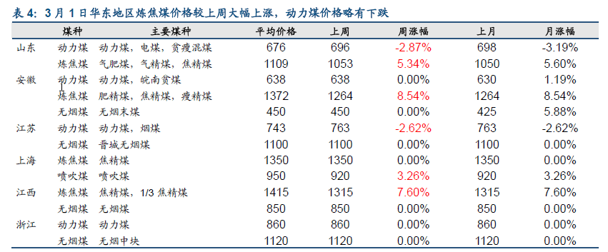 3月1日華東地區(qū)煉焦煤價(jià)格較上周大幅上漲,動(dòng)力煤價(jià)格略有下跌