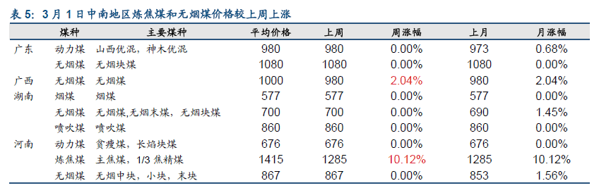 3 月1日中南地區(qū)煉焦煤和無煙煤價格較上周上漲