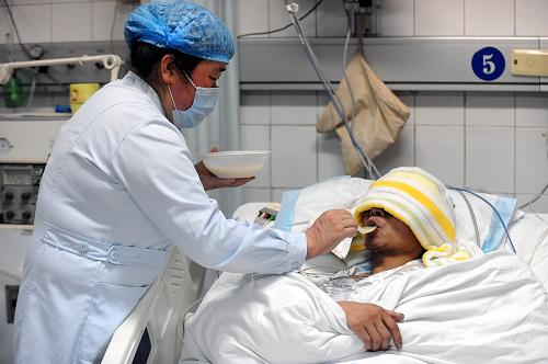 6月7日,在晉煤集團(tuán)總醫(yī)院重癥監(jiān)護(hù)室內(nèi),護(hù)士為陜西籍獲救礦工邱士富喂食小米粥。