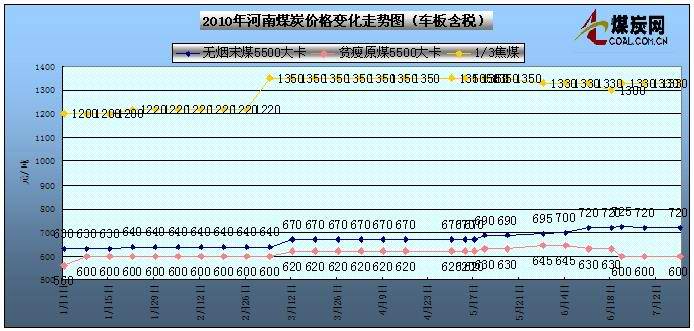 地區(qū) 品種 熱量(大卡/千克) 灰份(%) 水分(%) 含硫量(%) 揮發(fā)份(%) 價(jià)格(元/噸) 價(jià)格類型 湖南郴州 無(wú)煙混煤 5800 20 ≦0.9 6 700 出廠含稅價(jià) 無(wú)煙混煤 >6000 4 7 0.3 8 720 出廠含稅價(jià) 無(wú)煙原煤 >6300 <15 <1 <10 760 車(chē)板含稅 無(wú)煙末煤 5500 12 <1.2 6~7 620 出廠含稅價(jià) 噴吹煤 6500 9~12 0.6 6~7 870 出廠含稅價(jià) 湖南株洲 煙混煤 5500 18 8 <1 26 560 出廠含稅價(jià) 無(wú)煙塊煤 6000 19-21 <1 5 860 出廠含稅價(jià) 無(wú)煙末煤 5000 19-21 1 5 575 出廠含稅價(jià) 無(wú)煙混煤 6000 6 4 1 5 640 出廠含稅價(jià) 湖南湘潭 煙煤 5500 1 21-23 670 車(chē)板價(jià) 主焦精煤 G75 V 1450-1500 出廠含稅價(jià) 湖南漣源 煙煤 5500 8~13 2 23-30 640 出廠含稅價(jià) 湖南婁底 煙煤 5000 2 15-17 560 出礦含稅價(jià) 湖南長(zhǎng)沙 動(dòng)力煤 4000 41 4 22 410 出礦含稅價(jià) 氣肥煤 Q>6000 V 850 出礦含稅價(jià) 氣肥煤 Q>5000 V 775 出礦含稅價(jià) 湖南耒陽(yáng) 無(wú)煙原煤 Q< 750 車(chē)板含稅 無(wú)煙精煤 Q 800 車(chē)板含稅
