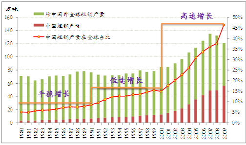近三十年來,我國粗鋼產(chǎn)量在全球的占比持續(xù)上升,大致可劃分為三個(gè)階段:1980年~1989年的平穩(wěn)增長期,我國粗鋼產(chǎn)量在全球的占比增長不明顯,十年間僅從5%左右略升至7%左右;1990年~1999年的低速增長期,我國粗鋼產(chǎn)量在全球占比的增速有所擴(kuò)大,由8%左右升至15%左右的水平;2000年~2009年的高速增長期,這十年間我國粗鋼產(chǎn)量快速增長,其在全球占比的增速也明顯加大,2009年我國粗鋼產(chǎn)量在全球的占比達(dá)到近47%,較2000年的15%增長了近兩倍以上。