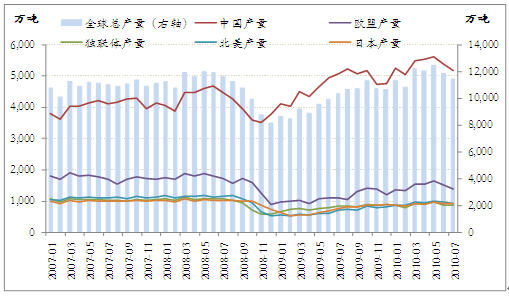 當(dāng)前,我國粗鋼產(chǎn)量已經(jīng)占據(jù)了全球粗鋼總產(chǎn)量的近半壁江山,在各主要發(fā)達(dá)國家及地區(qū)經(jīng)濟(jì)尚在復(fù)蘇之中的后危機(jī)時(shí)代,我國粗鋼產(chǎn)量在全球比重或?qū)⒊掷m(xù)高位,但未來這一比重繼續(xù)增長的空間可能相對有限。這主要在于近年來印度、獨(dú)聯(lián)體、巴西等其它新興國家對鋼材的需求也在不斷增加,隨著這些地區(qū)鋼鐵產(chǎn)量的增大,預(yù)計(jì)后期我國粗鋼產(chǎn)量在全球的占比可能會(huì)出現(xiàn)小幅下滑。