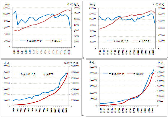 圖3 1980年以來美、日、印、中四國粗鋼產(chǎn)量與GDP對比
