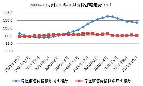 10月份,新建住宅銷售價格同比上漲10.6%,漲幅比9月份縮小0.7個百分點;環(huán)比上漲0.3%。其中,商品住宅銷售價格上漲11.9%,其中普通住宅銷售價格上漲11.0%,高檔住宅銷售價格上漲14.8%;經(jīng)濟(jì)適用房銷售價格上漲0.9%。與上月相比,商品住宅銷售價格上漲0.3%,其中普通住宅銷售價格上漲0.4%,高檔住宅銷售價格上漲0.2%;經(jīng)濟(jì)適用房銷售價格下降0.1%。