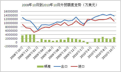 據(jù)海關(guān)總署10日公布的數(shù)據(jù)顯示,10月份中國進(jìn)出口值2448.1億美元,同比增長24%,環(huán)比下降10.4%。其中出口1359.8億美元,同比增長22.9%,環(huán)比降6.2% ;進(jìn)口1088.3億美元,同比增長25.3%,環(huán)比降15% 。10月份貿(mào)易順差為271.5億美元,相較9月份增加102.2億美元。