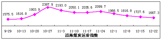 【運(yùn)價(jià)】本周沿海煤炭運(yùn)費(fèi)繼續(xù)下跌,但2010年12月22日國(guó)家發(fā)改委上調(diào)了成品油價(jià)格,因此,海運(yùn)費(fèi)價(jià)格下降幅度進(jìn)一步縮小。12月22日,秦皇島至廣州、上海和寧波的航線運(yùn)價(jià)分別為58元/噸、47元/噸和48元/噸,比上周分別下降5元 /噸、3元/噸和3元/噸,天津、京唐至上海的航線運(yùn)價(jià)49元/噸,比上周下降2元/噸。隨著天氣轉(zhuǎn)冷,或?qū)⒂绊懨禾窟\(yùn)輸,沿海煤炭運(yùn)價(jià)也將隨之回升。