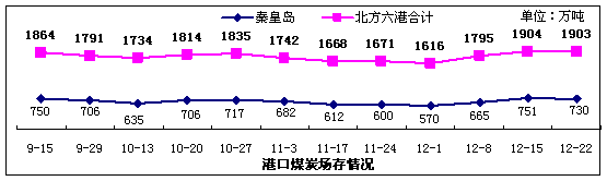 【庫(kù)存】截至12月22日,北方六港(不包括黃驊港)煤炭庫(kù)存1903萬(wàn)噸,較上周減少1萬(wàn)噸,下降 0.1%。本周后期,北方港口又出現(xiàn)惡劣天氣而封航。12月21日8點(diǎn)京唐港區(qū)出現(xiàn)大霧,能見(jiàn)度極低,海事部門(mén)通知封航,這是2010年以來(lái)持續(xù)時(shí)間最長(zhǎng)、能見(jiàn)度最低的一次大霧,港內(nèi)各作業(yè)公司停止作業(yè)。21日14點(diǎn)40分,秦皇島港全港封航。受封航影響,航船舶無(wú)法正常離靠,對(duì)兩港裝船量有所影響,兩港煤炭庫(kù)存量或?qū)⒃俅闻噬?/P>