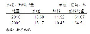 2010年生產熟料11.52億噸,熟料占水泥產量比重61.67%,比去年下降了近3個百分點。