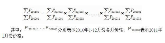 另外,目前的統(tǒng)計方法是將2010年2-12月份(11個月)的環(huán)比數(shù)據(jù)連乘,再乘以2011年1月份環(huán)比數(shù)據(jù)生成本月同比價格指數(shù)。之前的方法是當月的價格直接與去年同期的價格相比,現(xiàn)在的方法更具有連續(xù)性和穩(wěn)定性,盡可能的減小與實際情況的偏差。