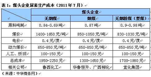 表1分別從無煙煤(小塊、中快、大塊)、煙煤以及無煙粉煤把煤頭尿素企業(yè)分為三類。從結果可以看出:使用無煙塊煤為原料的企業(yè)每噸尿素成本控制在1950-2250元/噸,有些甚至更高;無煙粉煤略低為1700-1980元/噸。當然,這些成本核算是在晉煤在7月將無煙煤價格上調(diào)30-50元之后所得出的結果。表中可以看出:使用煙煤的成本最低,但由于大面積推廣煙煤技術有一定難度,所以這部分企業(yè)所占比例極小。絕大多數(shù)的尿素企業(yè)還是那些高成本工藝,且要占到全國煤頭企業(yè)的60%以上。