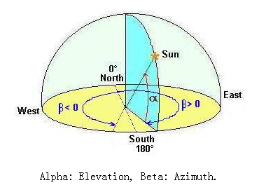 太陽在天空中的位置可以由太陽高度角和太陽方位角來確定。太陽高度角又稱太陽高度、太陽俯仰角,是指太陽光線與地表水平面得之間的夾角。太陽方位角即太陽所在的方位,是指太陽光線在地平面上的投影與當?shù)刈游缇的夾角,可以近似看作是樹立在地面上的直線在陽光下的陰影與正南方向的夾角。太陽方位角和高度角的實時數(shù)值可以通過地理經緯度、時區(qū)參數(shù)利用公式計算出來。