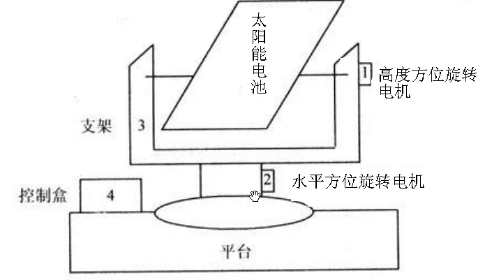 本文所設計跟蹤調整裝置其結構如下圖所示:它主要由底座、立軸、橫軸、兩臺旋轉電機、傳動齒輪等組成。其中旋轉電機1驅動橫軸,支撐太陽能電池板繞橫軸運動,跟蹤高度角運行。旋轉電機2驅動水平軸,以跟蹤方位角變化。