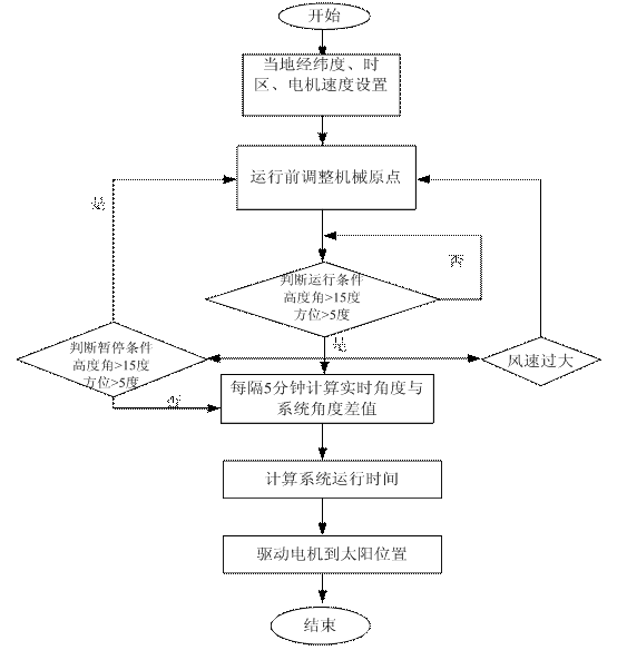 通過程序控制,可以自動判斷是否滿足運行條件從而達到自動啟動運行裝置、自動停止、返回初始狀態(tài)等控制。增加風力傳感器用于對系統(tǒng)的保護作用,當風力大于一定數(shù)值時,系統(tǒng)停止工作,復位到原點,風速滿足工作條件時,系統(tǒng)自動開始工作。太陽能電池板有兩個自由度,控制機構對高度角和方位角兩個方向進行調整。當電池板轉到盡頭時,由于跟蹤裝置裝了限位傳感器,到限位觸點時自動切斷輸出,電機停止工作。