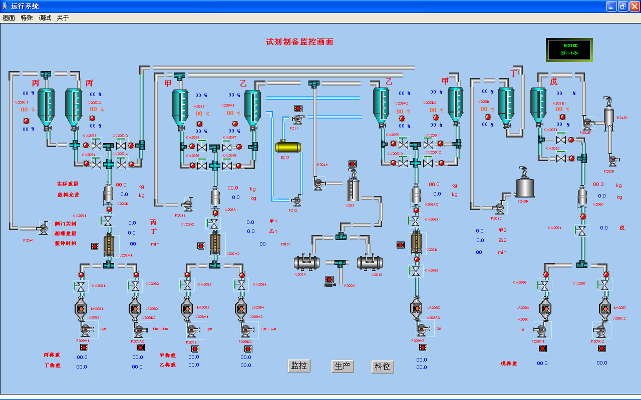 試劑配置控制系統(tǒng)是根據生產需要選擇相應的試劑根據設定好的重量,按種類分先后稱重,控制每種試劑的快慢出液閥開關和每種試劑配置的先后順序,實現精確稱重。將稱重好的試劑進行攪拌,輸送到指定配置倉,根據實際情況通過試劑投加泵進行對粉料投加。