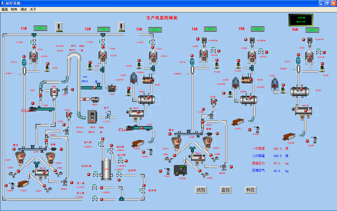 粉料配置控制系統(tǒng)是6條粉料線與對應試劑控制線進行配比生產反應輸送到包裝系統(tǒng),其中包括氣流干燥系統(tǒng)的溫度、壓力由PID控制實現,并有手動設定功能,控制生產線中的設備,實現在上位機中一鍵自動啟停和聯(lián)鎖,確保生產線的正常運行。