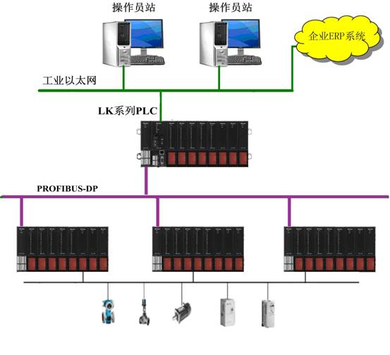 本系統(tǒng)采用計算機、PLC、智能儀表以及電氣控制柜構成的控制監(jiān)視管理系統(tǒng),通過PLC程序指令控制現場電氣設備的單機或者聯(lián)鎖運行,監(jiān)視電氣設備的運行狀態(tài),智能儀表采集現場溫度,壓力等數據,下位機PLC和上位機HollyView 通過以太網進行數據交互,通過上位機 HollyView 實時以動態(tài)圖形顯示生產流程,生產中的重要工藝數據,設備運行狀態(tài),報警故障信息,同時用戶可以根據生產中的實際情況通過上位機 HollyView 修改生產工藝參數來調整生產。使整個系統(tǒng)最大化的適應生產的需要。并且可以通過工業(yè)以太網和企業(yè)的ERP進行數據交換,便于企業(yè)對生產線進行管理。
