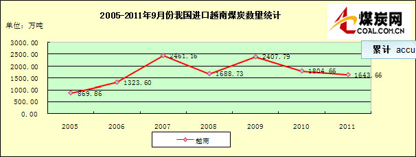2005-2011年9月份我國進口越南煤炭數(shù)量走勢統(tǒng)計