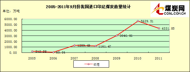 2005-2011年9月份我國(guó)進(jìn)口印尼煤炭數(shù)量走勢(shì)統(tǒng)計(jì)