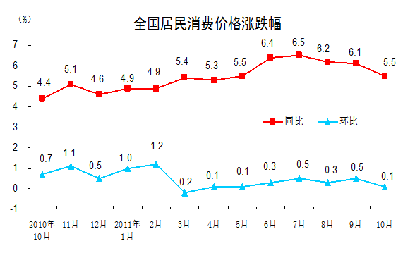 2011年10月份,全國居民消費(fèi)價格總水平同比上漲5.5%。其中,城市上漲5.4%,農(nóng)村上漲5.9%;食品價格上漲11.9%,非食品價格上漲2.7%;消費(fèi)品價格上漲6.6%,服務(wù)項(xiàng)目價格上漲2.8%。全國居民消費(fèi)價格總水平環(huán)比上漲0.1%。其中,城市上漲0.1%,農(nóng)村與上月持平;食品價格下降0.2%,非食品價格上漲0.2%;消費(fèi)品價格上漲0.1%,服務(wù)項(xiàng)目價格上漲0.2%。