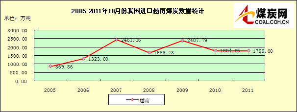 2005-2011年10月份我國進口越南煤炭數(shù)量走勢統(tǒng)計