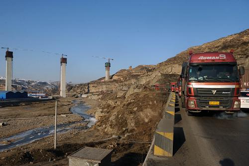 12月8日,在施工中的中南鐵路蔚汾河大橋工地邊,大量煤運(yùn)重卡正在313省道山西興縣段排隊(duì)通過(guò)。(新華社)