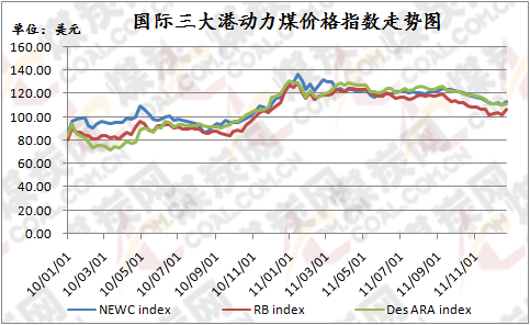 具體到三大動(dòng)力煤港口價(jià)格來看,截至12月23日,亞洲國際動(dòng)力煤的基準(zhǔn)價(jià)格澳大利亞紐卡斯?fàn)柛?/A>NEWC動(dòng)力煤價(jià)格指數(shù)本周整體上漲2.57美元,由上期的110.28美元/噸漲至112.85美元/噸,漲幅為2.3%。據(jù)相關(guān)消息稱,澳大利亞主產(chǎn)煤區(qū)Hunter Valley的潮濕天氣導(dǎo)致產(chǎn)量減少,供應(yīng)澳大利亞動(dòng)力煤的Orica連續(xù)關(guān)閉也使得煤炭生產(chǎn)受到限制,這些狀況對(duì)本周澳大利亞動(dòng)力煤價(jià)格的上漲起到一定的推動(dòng)。
